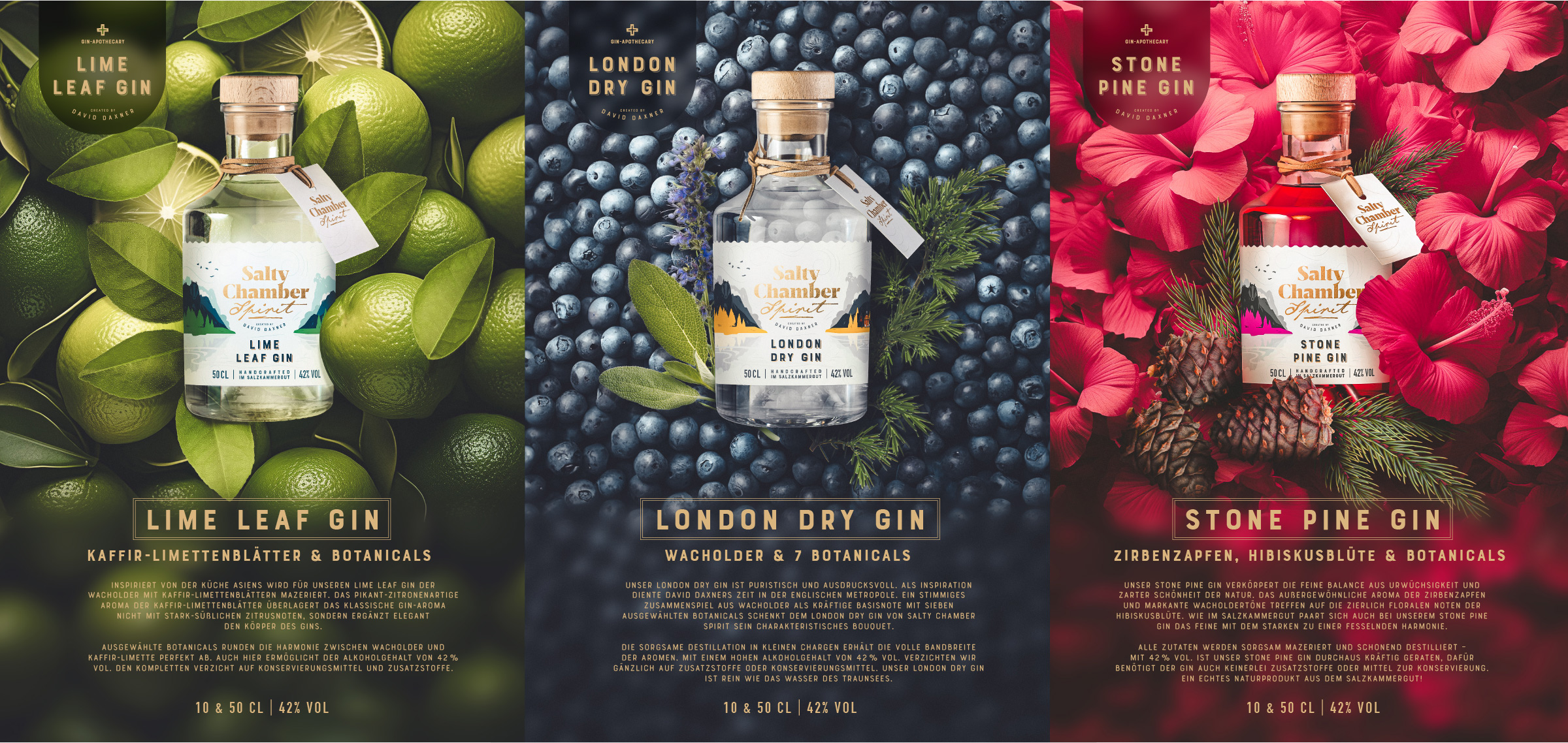 Die Marke „Salty Chamber Spirit” steht für außergewöhnliche Gins. Stone Pine, London Dry und Lime Leaf sind die ersten Variationen, die David Daxner kreierte, nachdem er die Welt erkundete und dabei seine Liebe zur Heimat neu entfachte. Und die Liebe zu Gin genauso. Dabei verbindet er verschiedenste Botanicals und außergewöhnliche Aromen mit dem Ursprünglichen des Salzkammerguts. Sein „Salty Chamber Spirit“ ist also als Hommage an seine Heimat zu verstehen, die gleichzeitig der Marke Authentizität verleiht. Die Etiketten fangen genau diesen Spirit ein – hauptsächlich durch die fein aufeinander abgestimmten Details der Illustrationen. Hier entdeckt man den Dachs als Verbindung zu seinem Namen, die Hütte als Symbolik fürs Aufwachsen in einer Apotheke und den Spirit selbst in Form des Geistes. Auch die ausgewählten Schriften unterstreichen das Gefühl des Ursprünglichen – traditionell, meistens modern, immer handgemacht. So wie die Gins selbst. That's the spirit. P.S.: Silberner Hahn beim Niederösterreichischen Werbepreis!