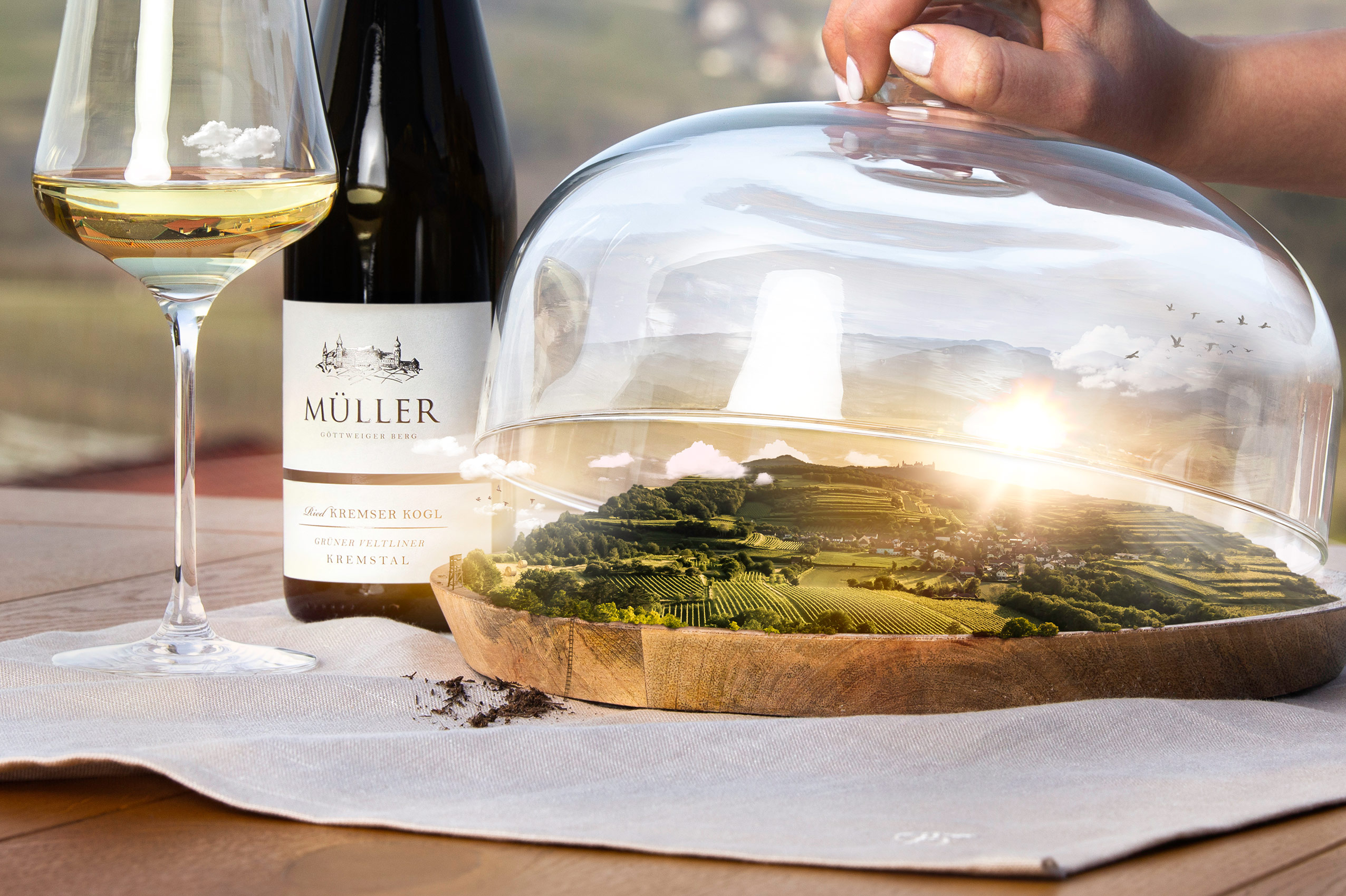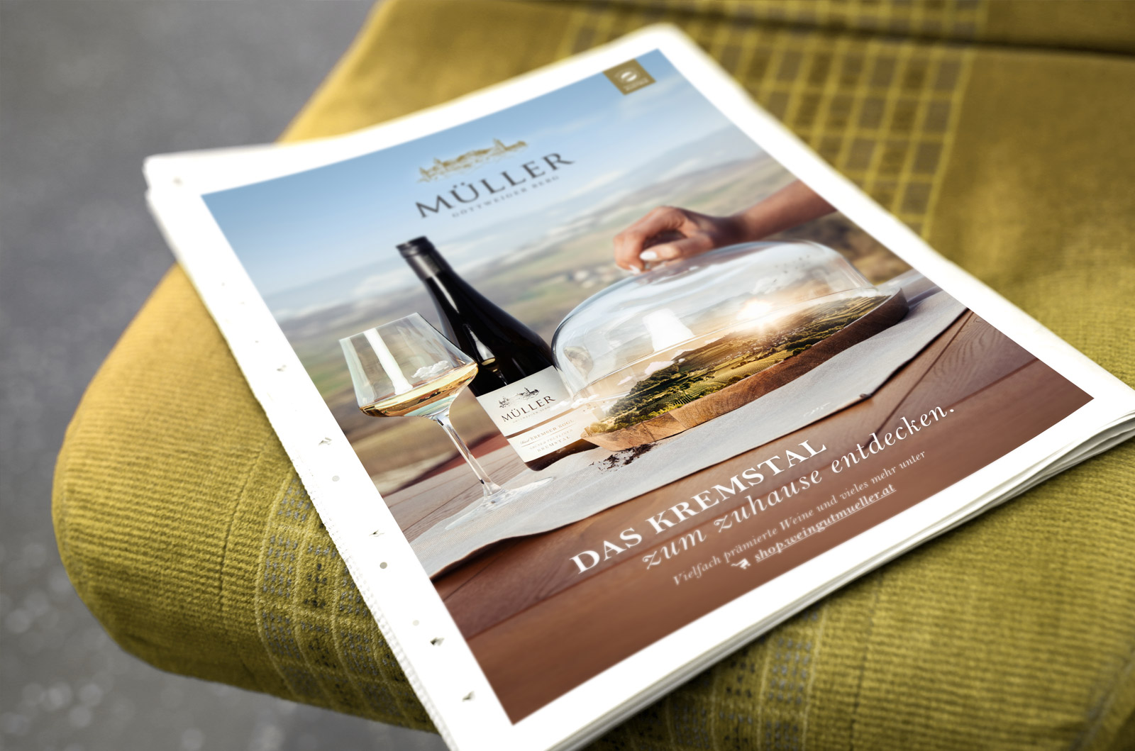 Ein Flaschenfoto da, ein Weingartenfoto dort. In der Weinwelt ist es schon ziemlich schwierig geworden, mit einem Inserat hervorzustechen. Eine Aufgabe, der ich mich gerne gestellt habe. Wein ist ja so etwas wie aufgefangene Natur, die in eine Flasche gebracht wird, oder das Terroir ins Glas. Hier, ein Teil des Kremstals unter eine Glaskuppel gesteckt: Wertschätzung der Natur, die perfekt konserviert und glasweise geschmeckt und entdeckt werden kann. UPDATE: Was für ein Erfolg beim Niederösterreichischen Landeswerbepreis Goldener Hahn 2022! Ich freue mich gemeinsam mit dem Weingut Müller über den Goldenen Hahn in der Kategorie Print.